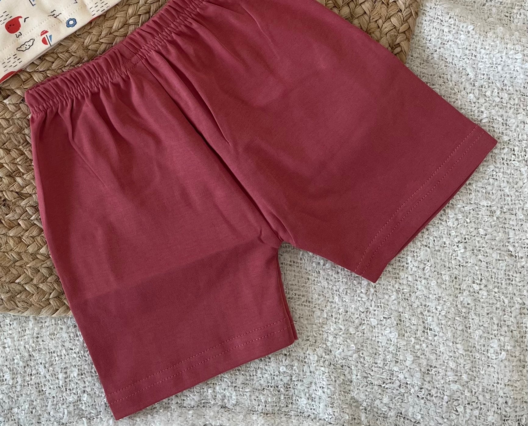 Let your little one’s feel comfortable in this hosiery fabric(cotton) beige and red set with boat designs in t-shirt and plain red shorts.