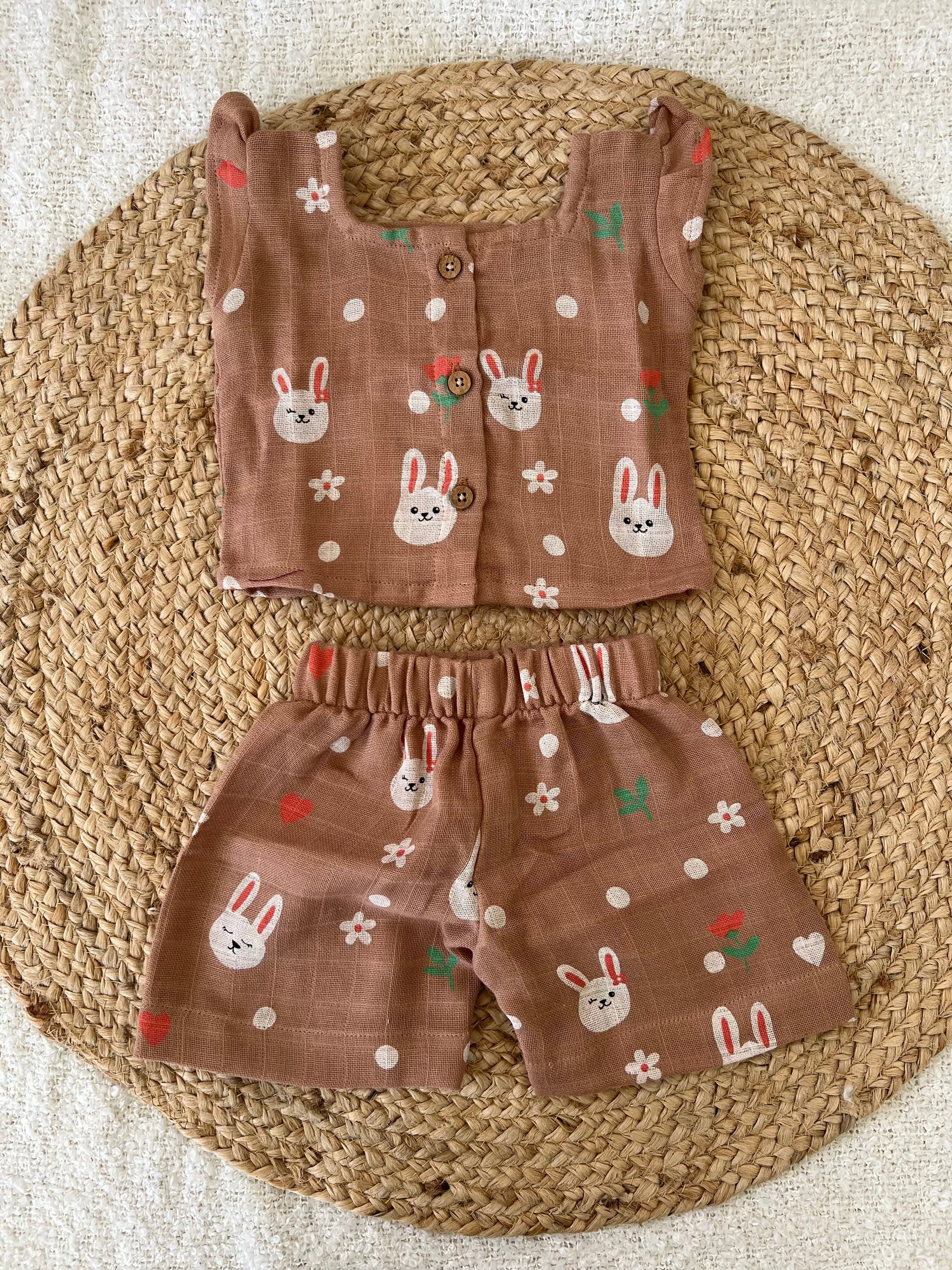 Let your little one’s feel comfortable in this brown muslin co-ords with rabbit designs and trousers are elasticised.