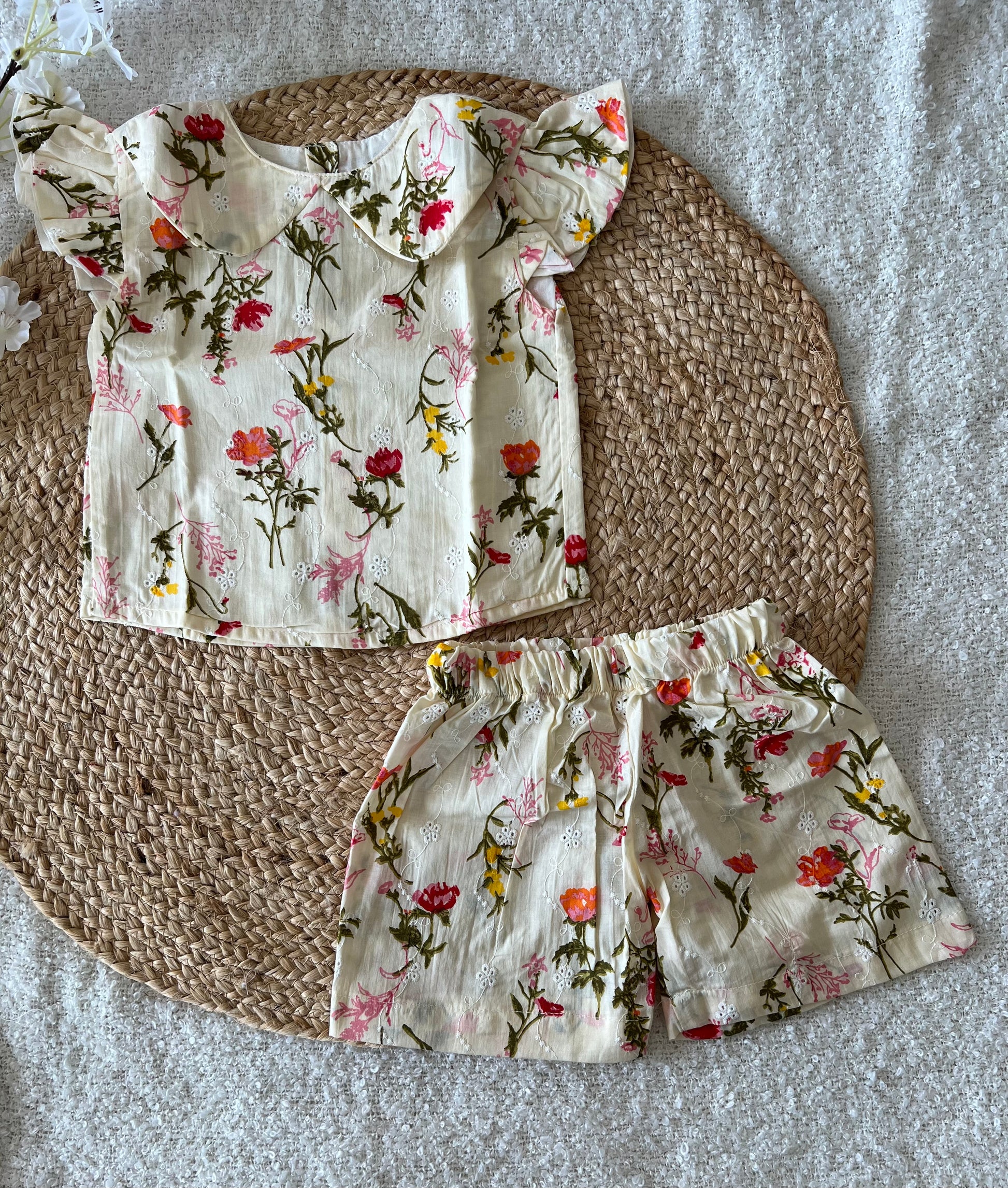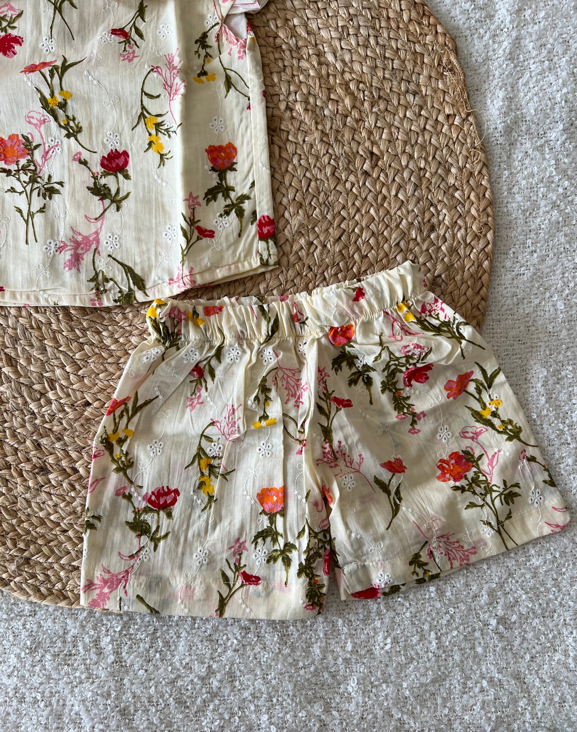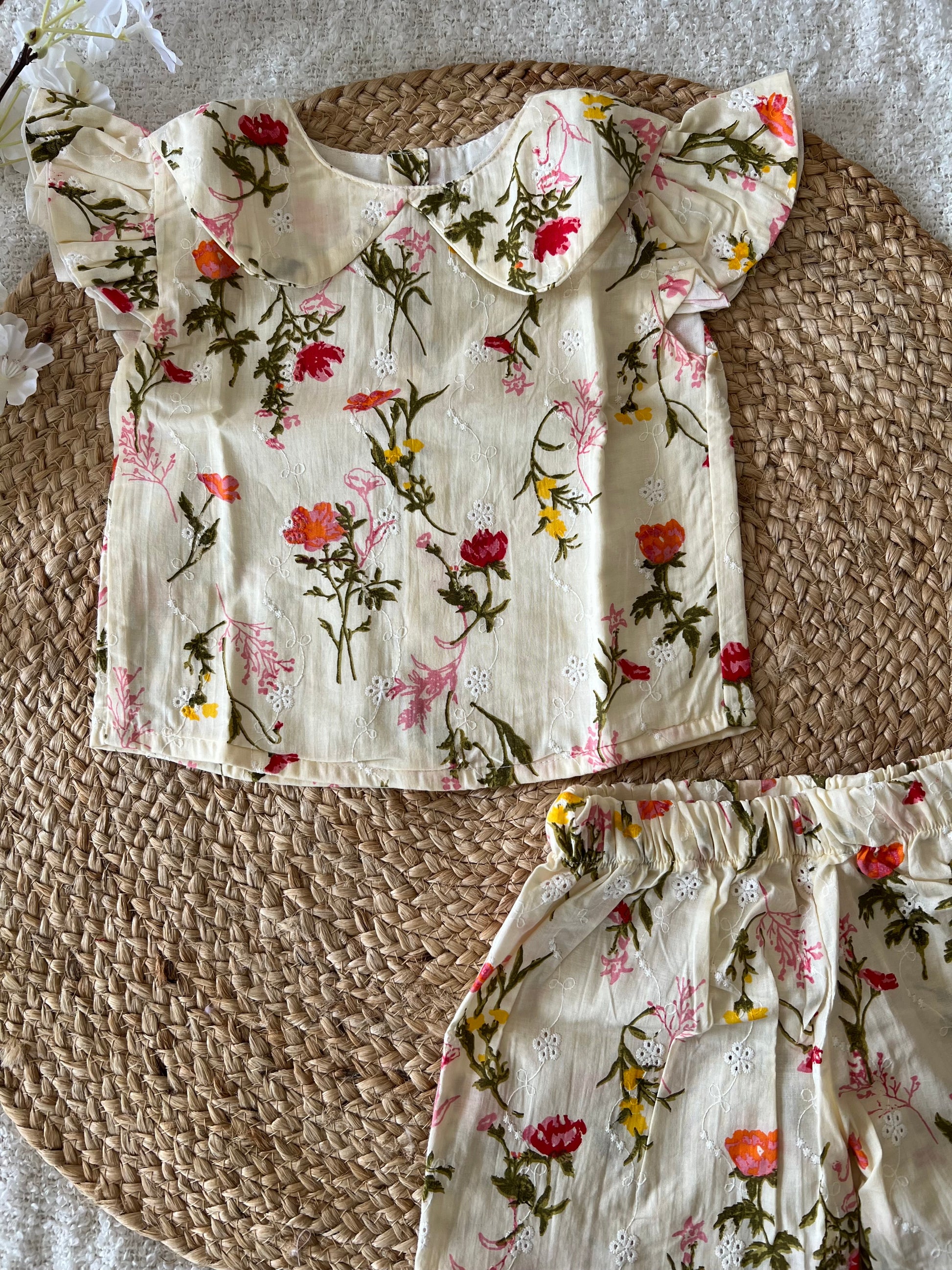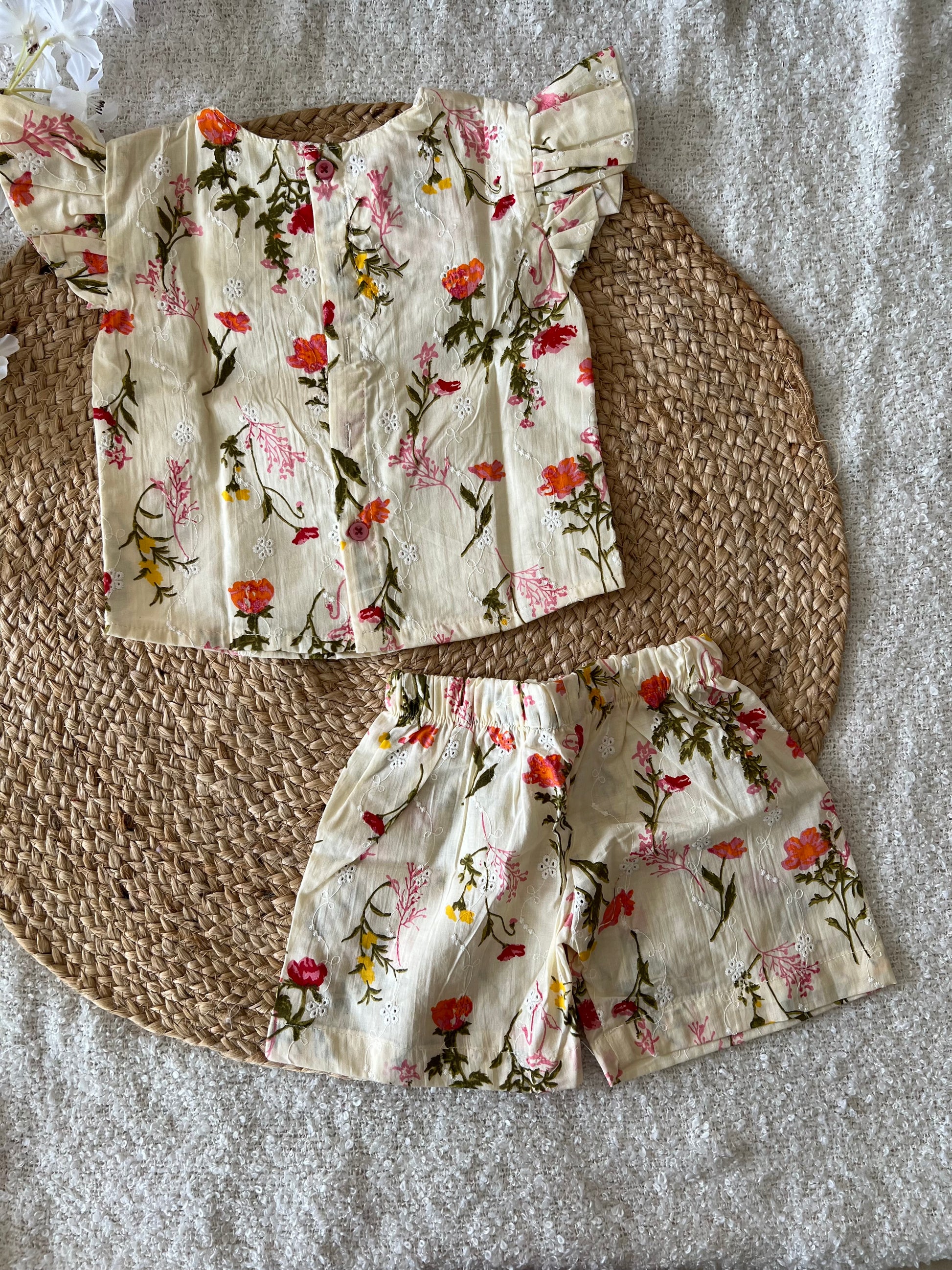 Let your little one’s feel comfortable in this cream white cotton co-ords with floral designs and elasticised shorts.