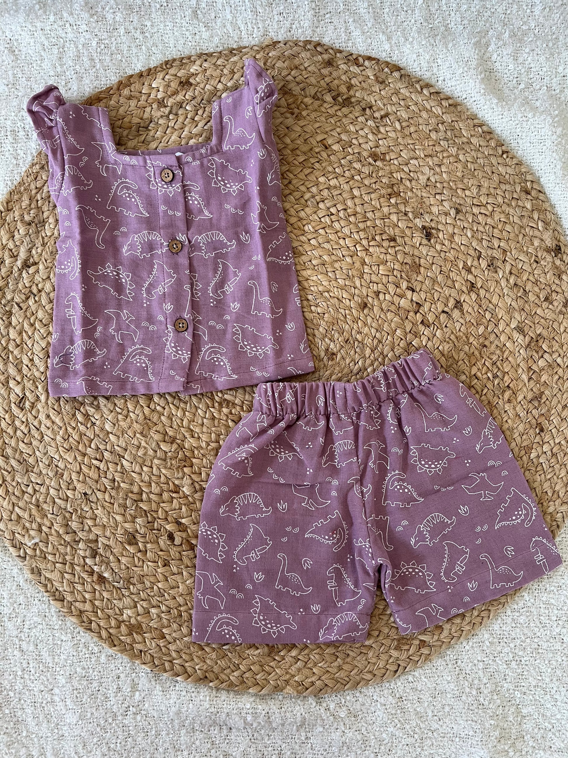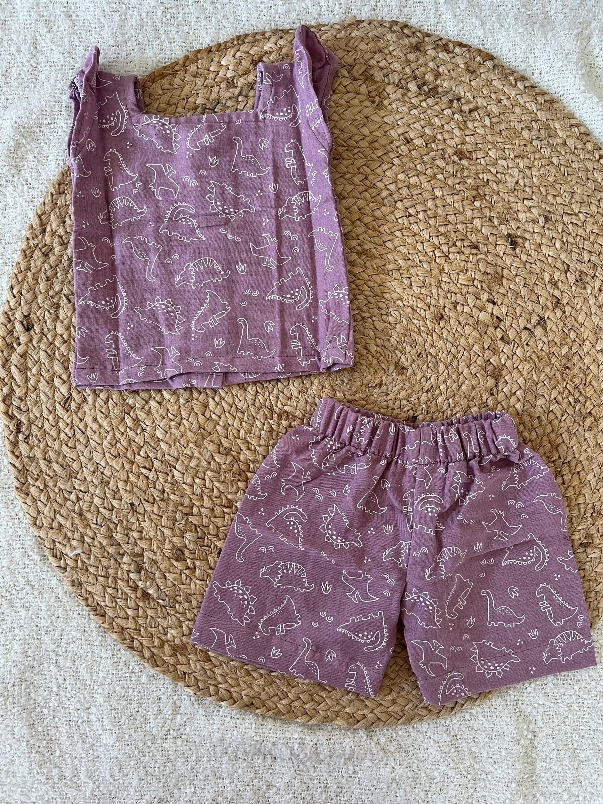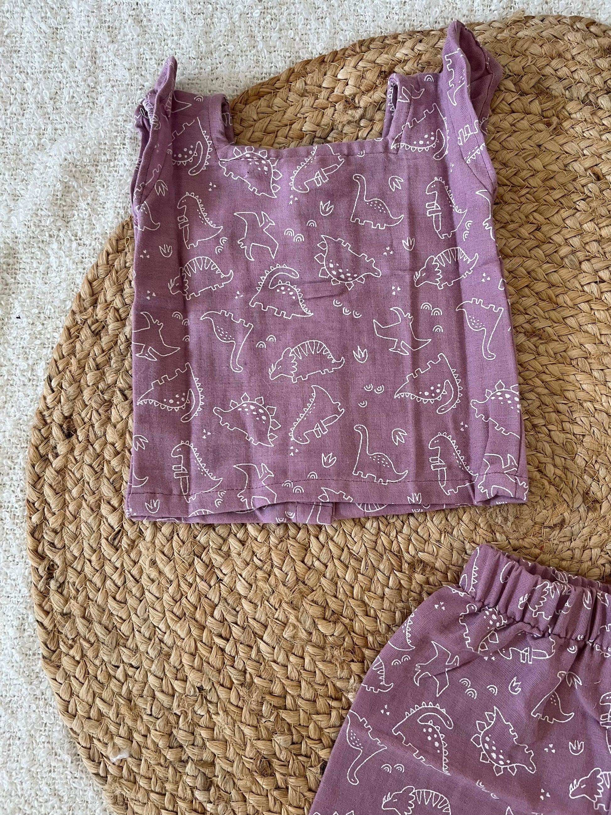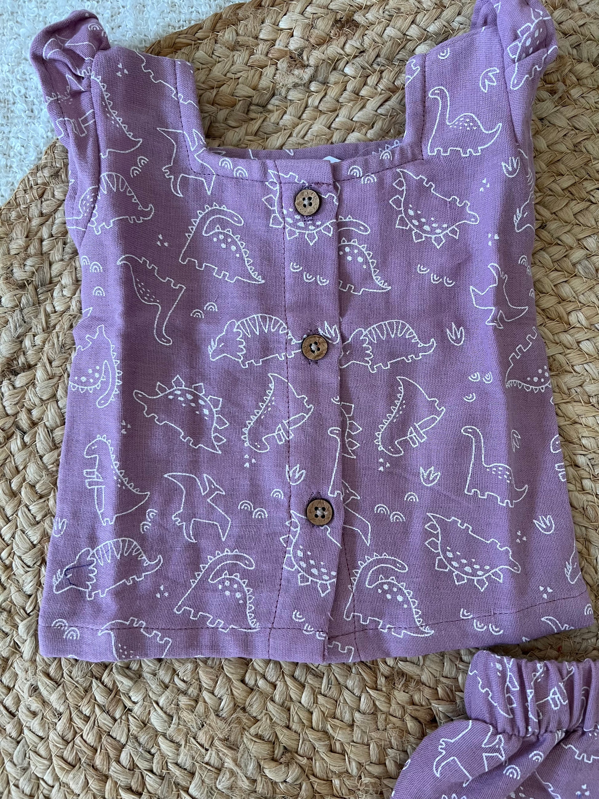 Let your little one’s feel comfortable in this purple muslin co-ords with dinosaur designs and the trouser is elasticised.
