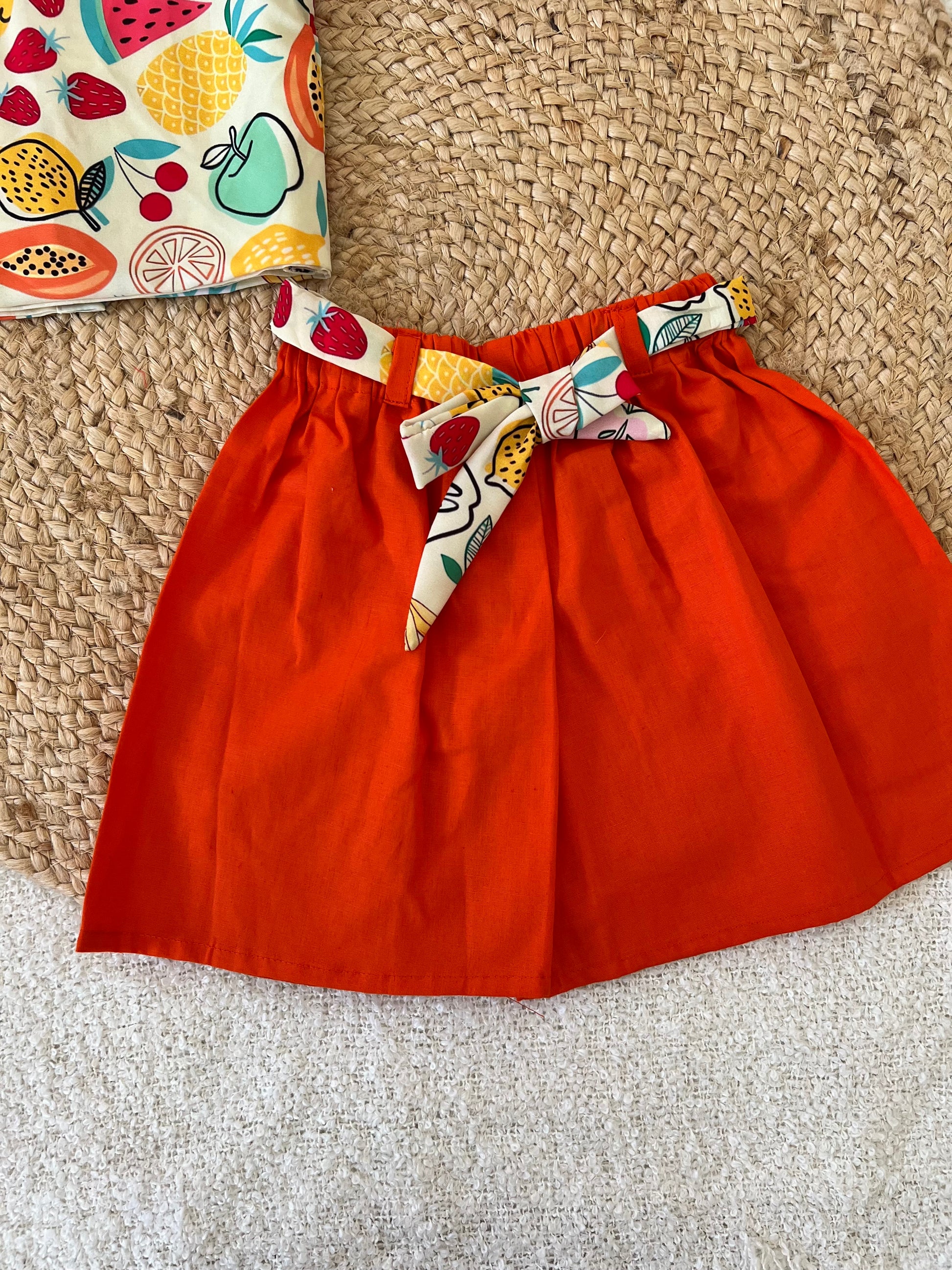 Let your little one’s feel comfortable in this cotton skirt and top with fruit designs in top and a bow lace in orange skirt.