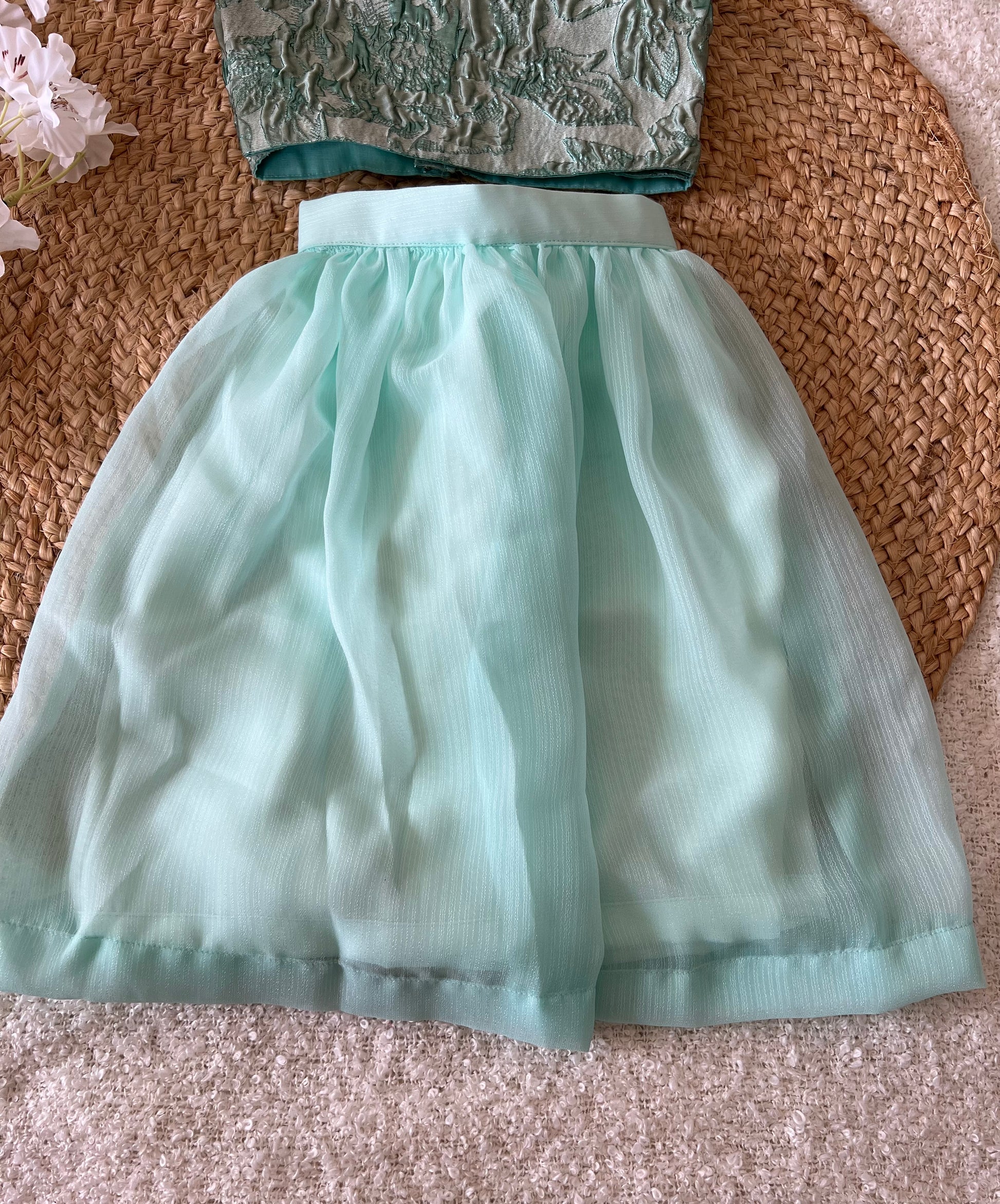 Let your little one’s feel comfortable in this pastel green chiffon frock and self embossed georgette top.