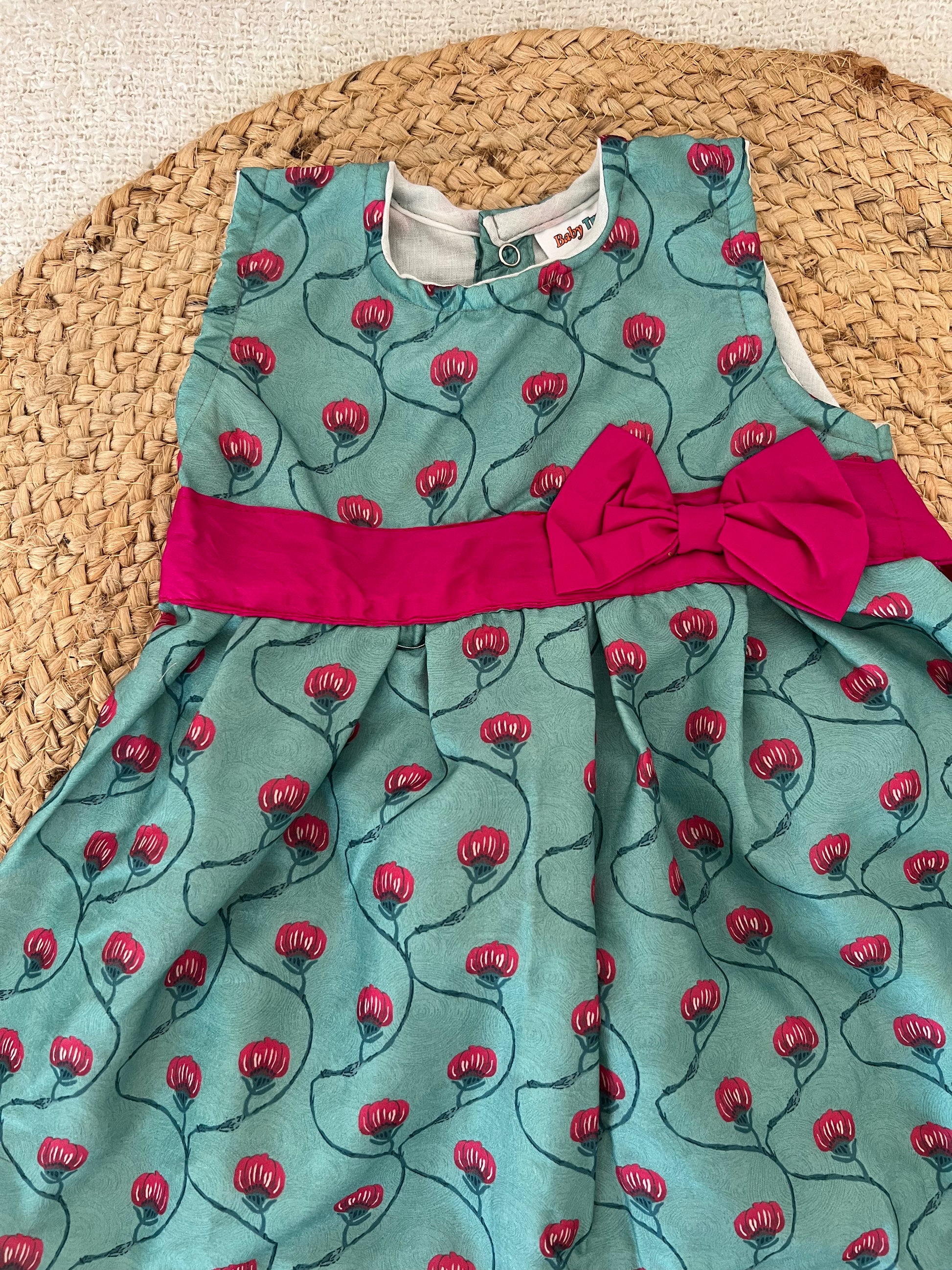 Let your little one’s feel comfortable in this chiffon green frock with lotus design and a pink bow in front.