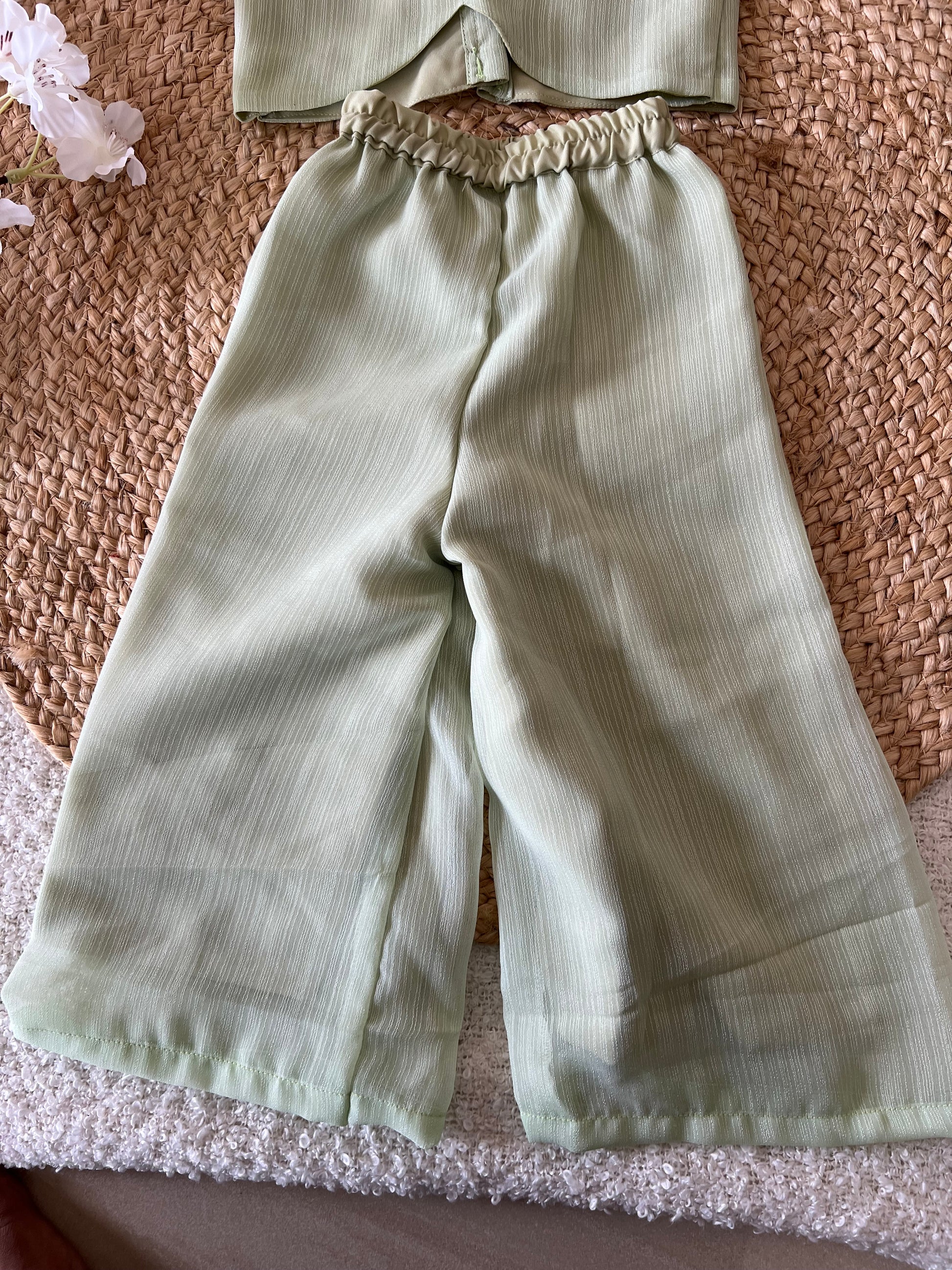 Let your little one’s feel comfortable in this green organza coat and top and pant set