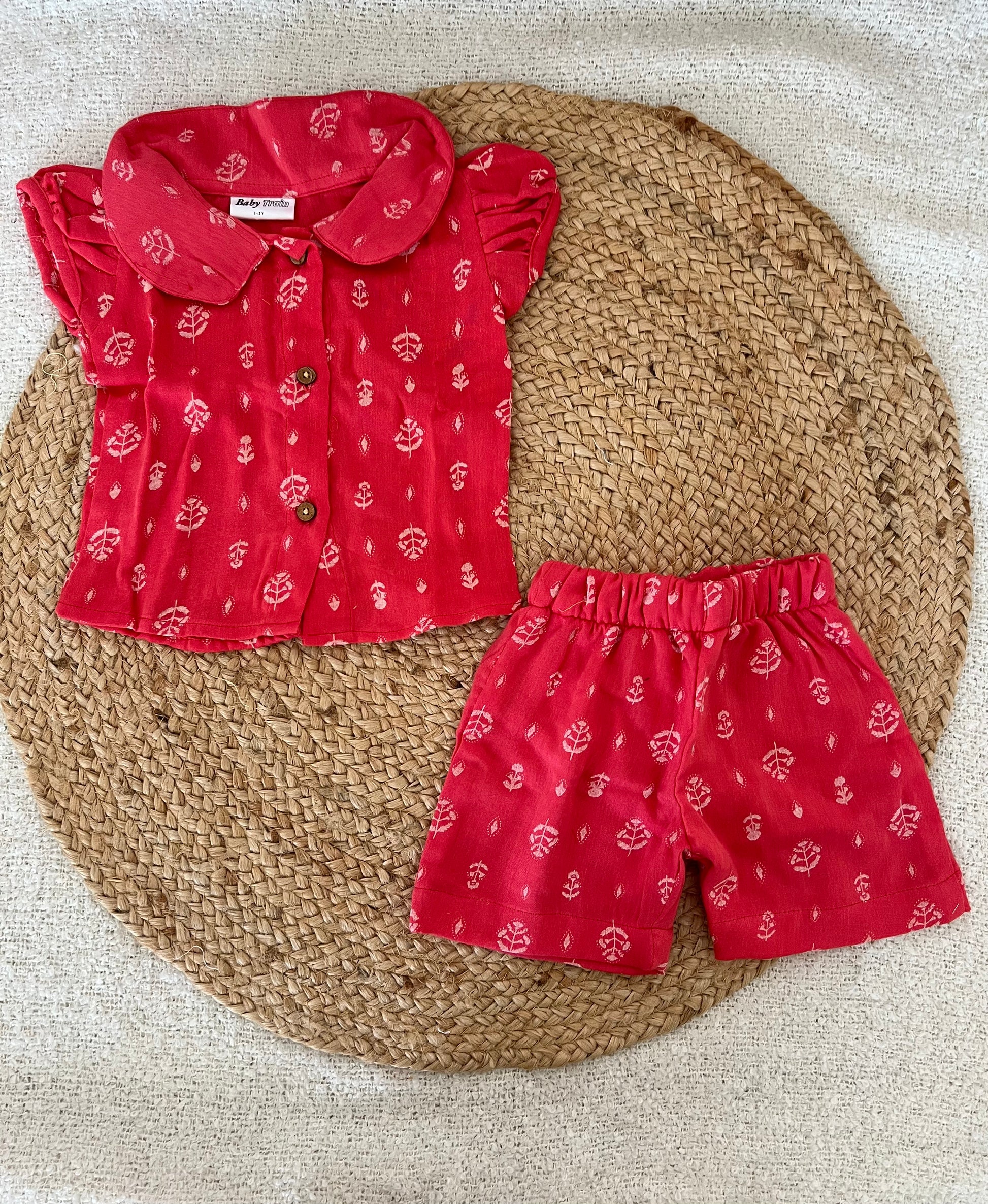 Let your little one’s feel comfortable in this red cotton co-ords with white designs and elasticised shorts.