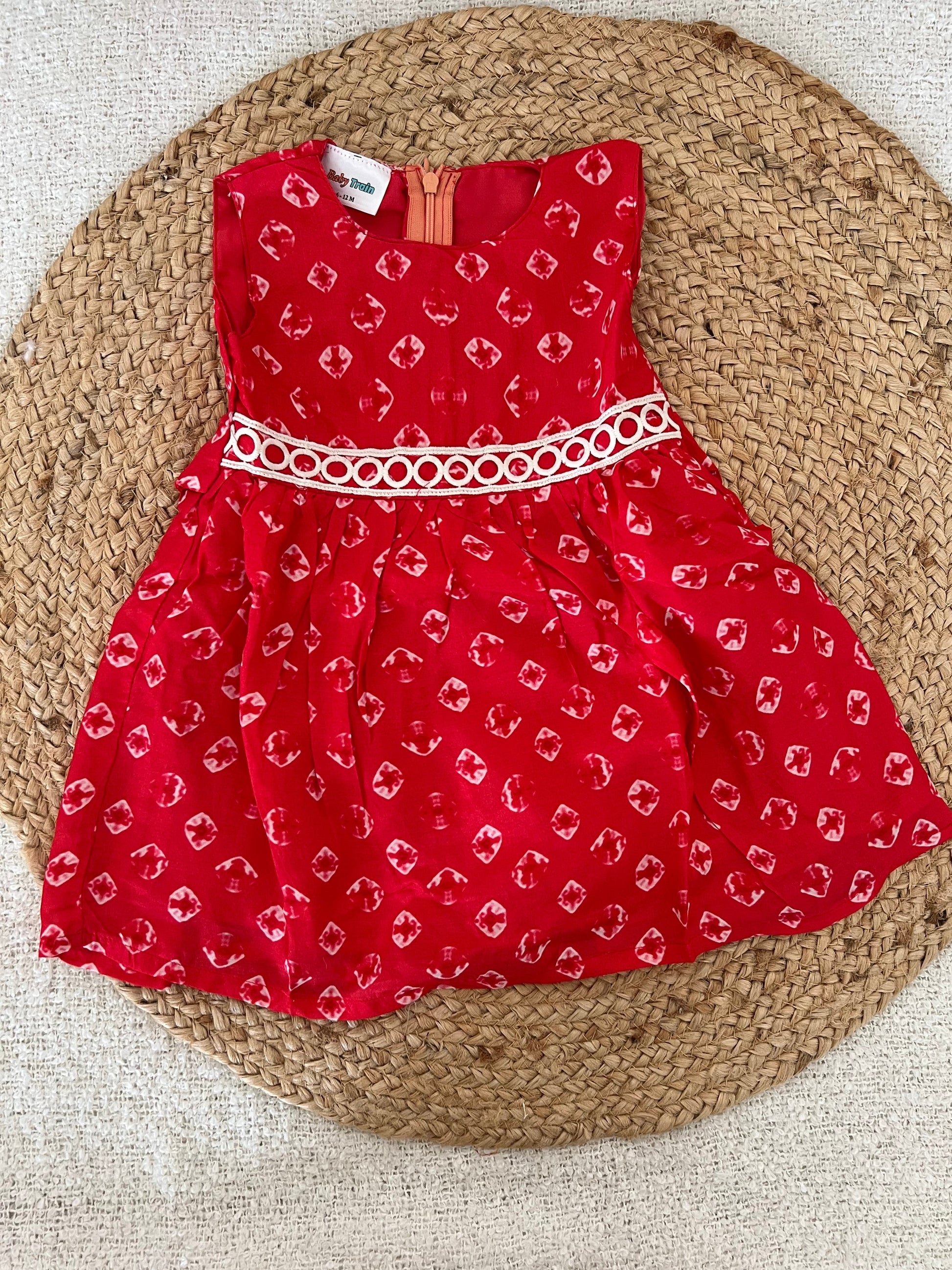 Let your little one’s feel comfortable in this red chiffon mix frock with lace work.