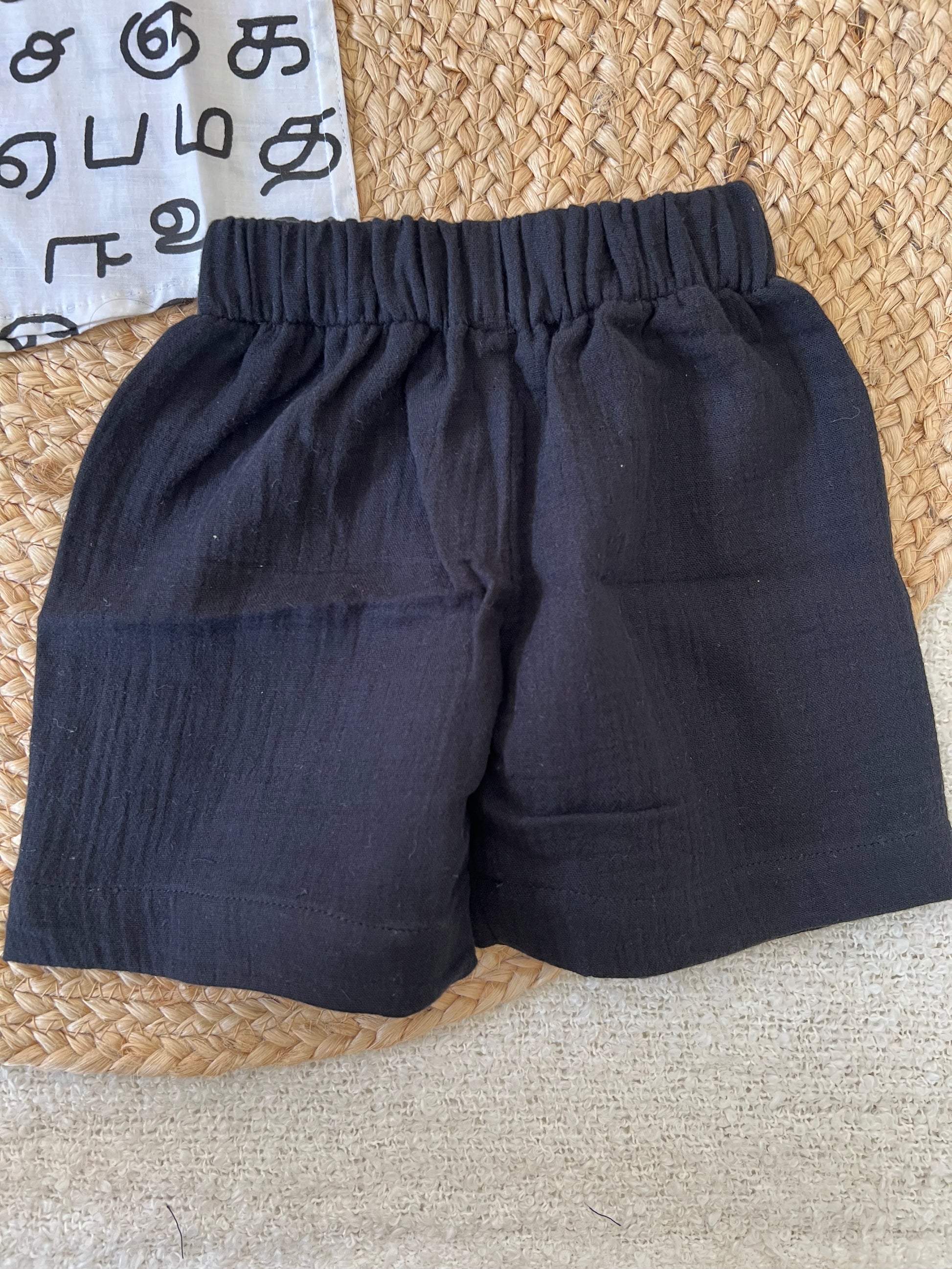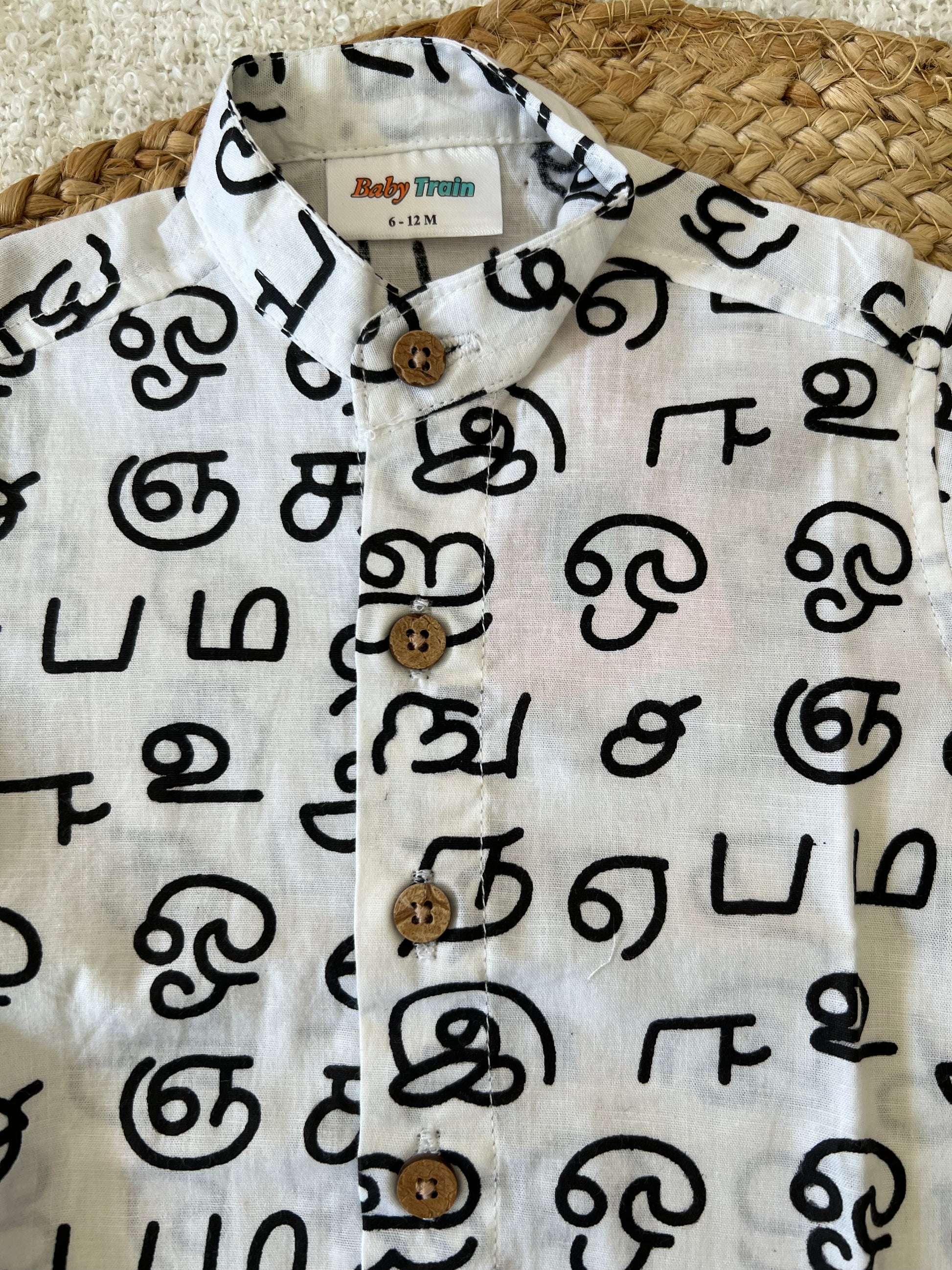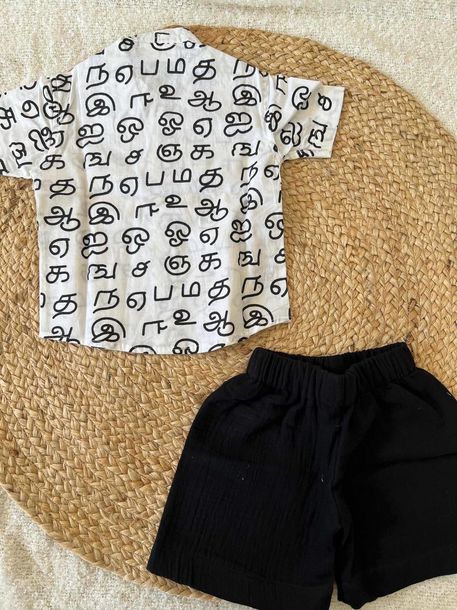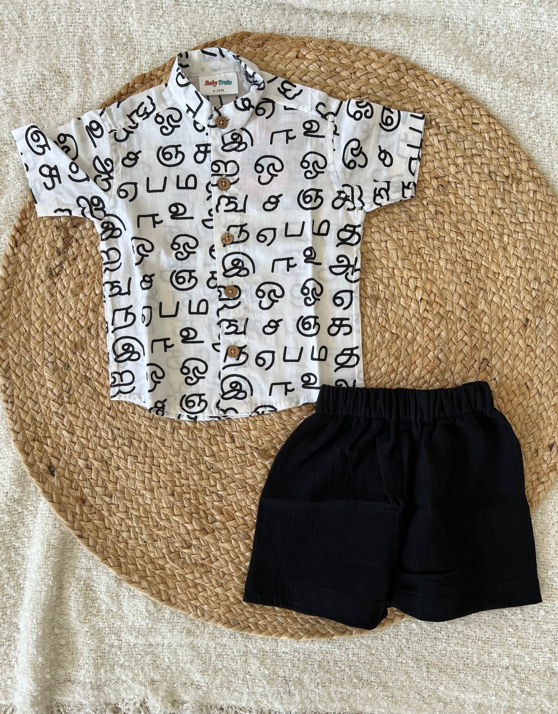Let your little one’s feel comfortable in this cotton shirt and double cloth muslin shorts and bloom in style in this white shirt with Tamil letters and black elasticised shorts.