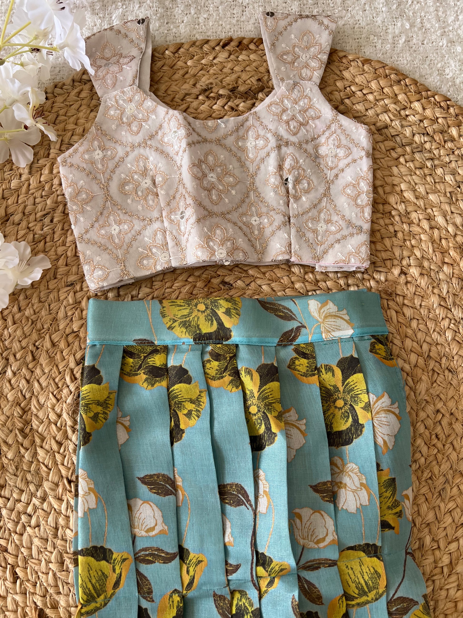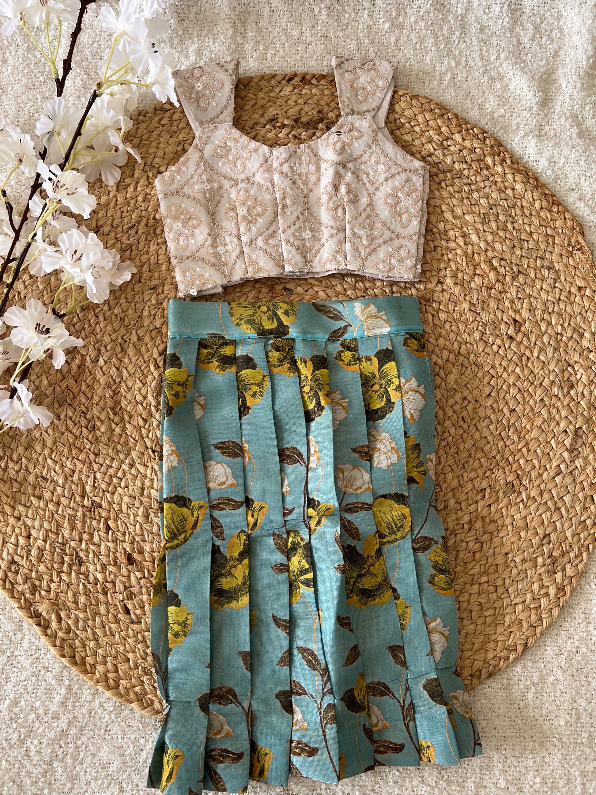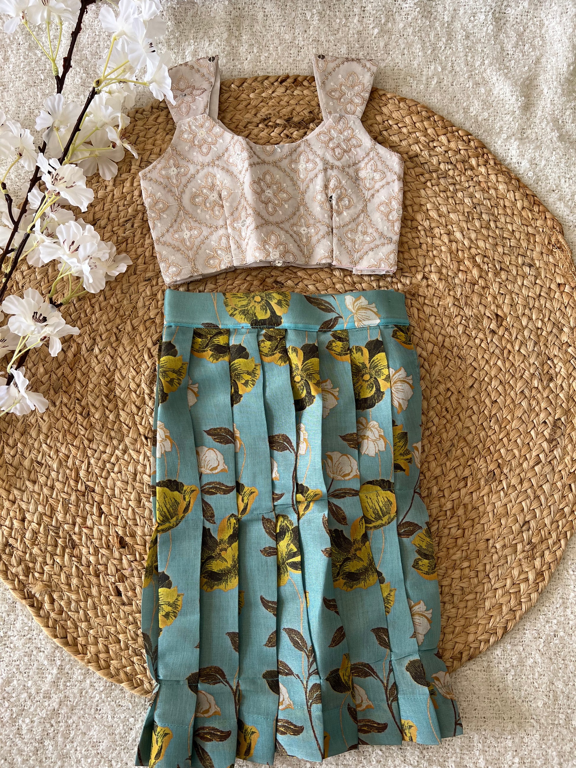 Let your little one’s feel comfortable in this white self embossed georgette top and raw silk frock.